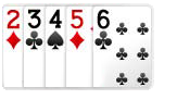 STRAIGHT : kombinasi kartu ini sama dengan STRAIGHT FLUSH, bedanya kalau STRAIGHT tidak memandang bunga, bunganya boleh bebas , misal : 4 ♠ – 5♥ – 6♦ – 7 ♣ – 8♦ atau 10♥ – J ♣ – Q ♠ – K♦ - As ♣